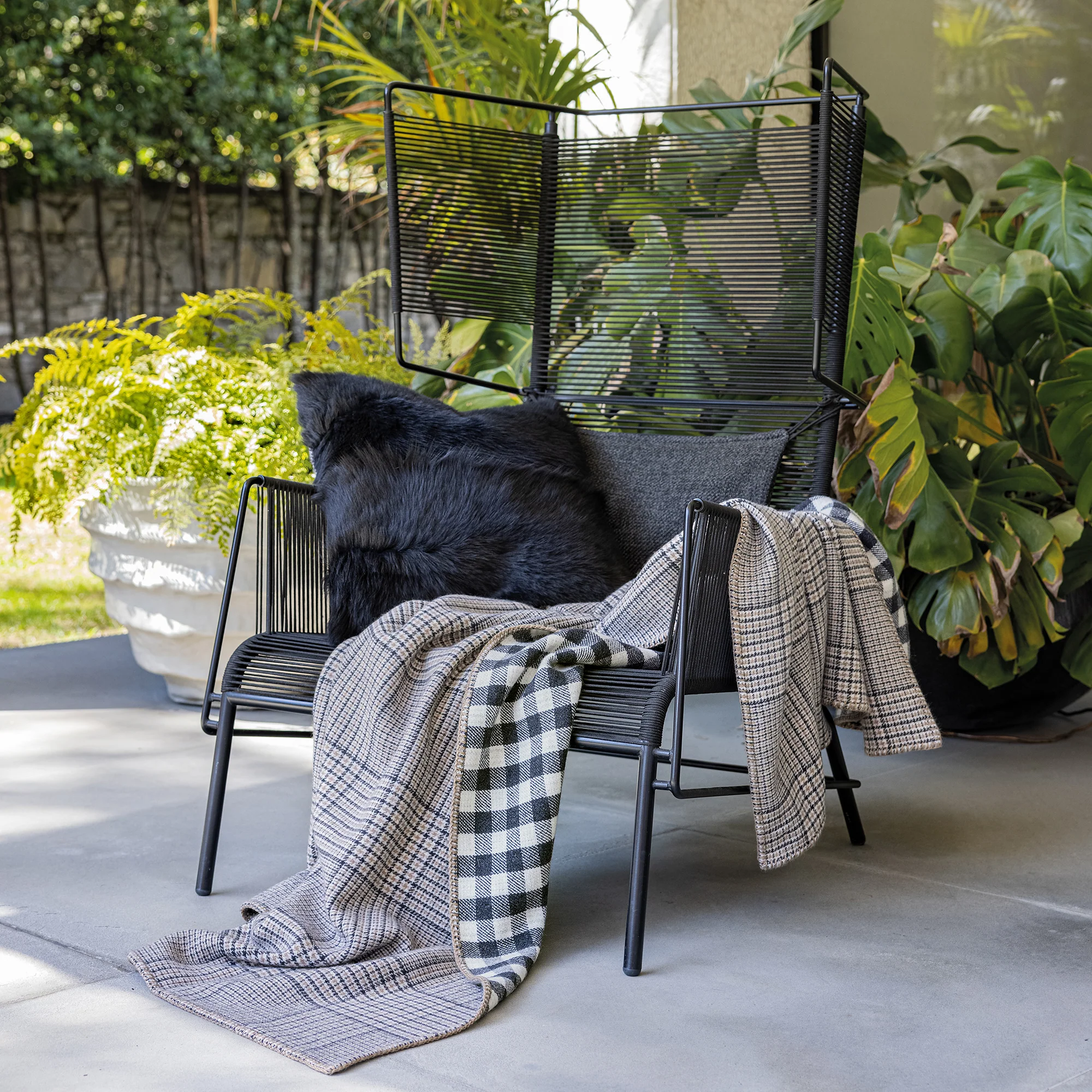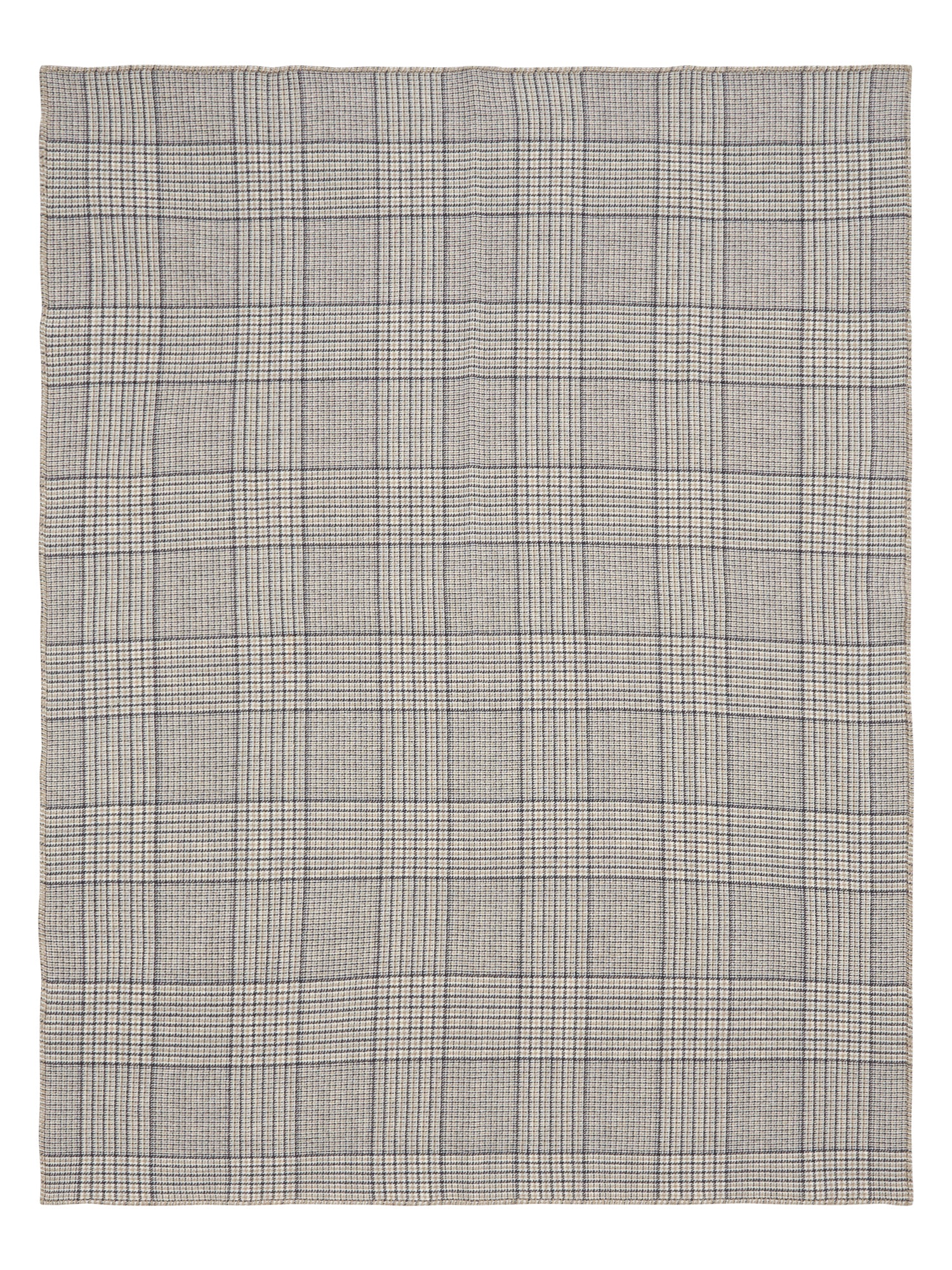 Ćebe od 100% kašmira sa dvostranim žakard tkanjem. Karirani uzorak i ručno završene ivice sa kontrastnim štepom daju mu sveden, savremen izgled. Lagano i mekano, namenjeno svakodnevnom komforu.
