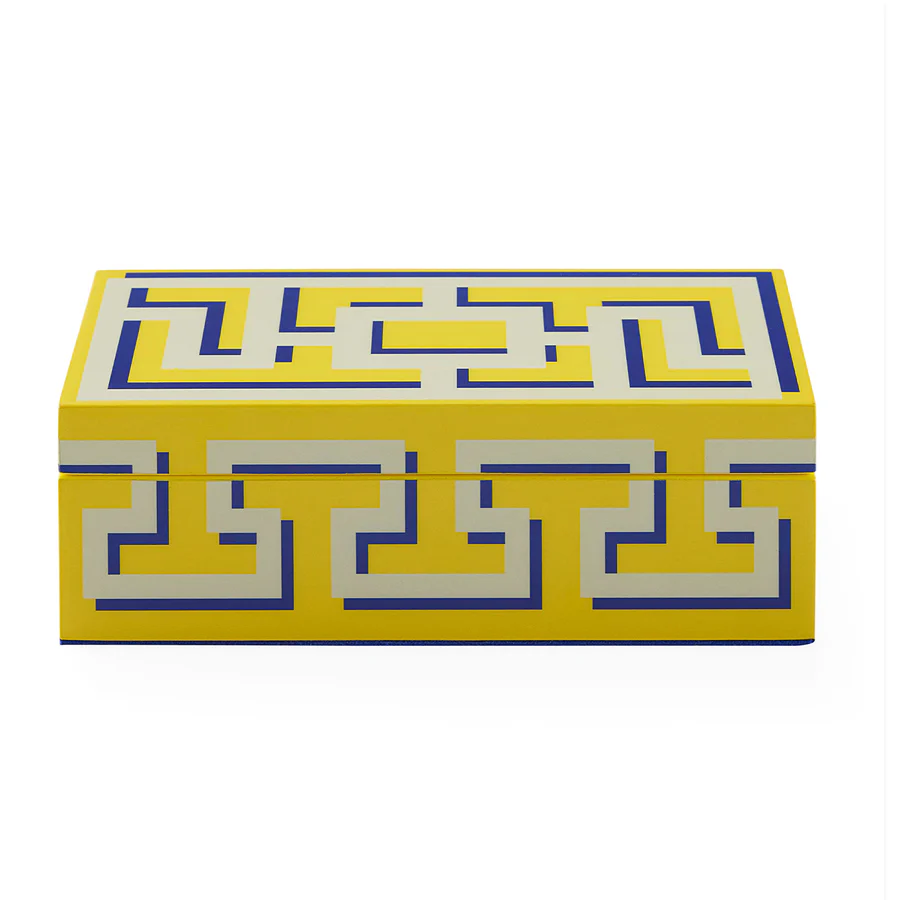 Naše ručno završene Labyrinth lakirane kutije koje se mogu slagati odlikuje klasičan uzorak reinterpretiran u tri električne nijanse. Donose živopisan nalet boje na tvoju policu, sto ili kamin. Dostupne su u tri veličine—za odlaganje, slaganje ili kao upečatljiv samostalni dekorativni komad.